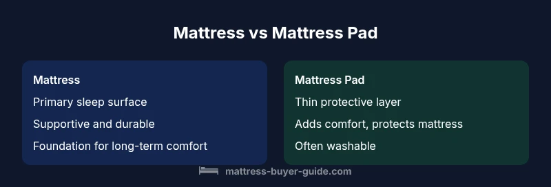 The core difference between a mattress and a mattress pad begins with function. A mattress is the primary sleeping surface that accepts and distributes body weight, supports spinal alignment, and resists sagging over time. It is built from sturdy materials—springs, foam, latex, or hybrids—and is designed to endure years of regular use. A mattress pad, by contrast, is a thin, flexible layer placed on top of the mattress. It serves mainly as a comfort booster and protective barrier. Pads are typically filled with padding or foam and wrapped in a fabric cover. The distinction matters for sleep quality, mattress longevity, and hygiene over the life of your bed. According to Mattress Buyer Guide, many shoppers confuse these terms, but understanding the difference helps you tailor a setup that matches your sleep goals. Here we unpack the key functional contrasts and what they mean for real-world use.