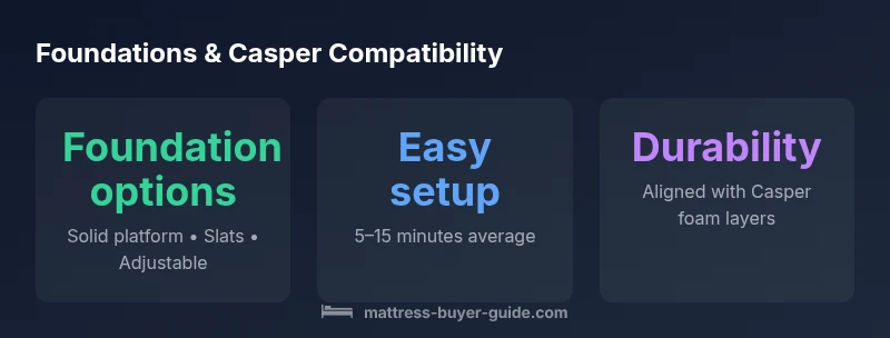 Casper mattresses are designed to deliver consistent support on a flat, sturdy foundation. The foundation works with the foam and comfort layers to maintain spinal alignment and pressure relief. While a box spring can be used in some setups, it is not required for Casper models. The Mattress Buyer Guide team emphasizes that the key is a level, rigid surface that evenly distributes weight across the mattress. A poorly chosen base can lead to sagging, uneven feel, and accelerated wear, diminishing the intended benefits of Casper’s foam layers. As part of our analysis, the team at Mattress Buyer Guide notes that most consumers can achieve optimal performance with a solid platform or a high-quality slatted base, provided the gaps are small and the surface is level. This approach aligns with typical recommendations for modern foam mattresses and helps protect warranty protections when foundations meet guidelines.
