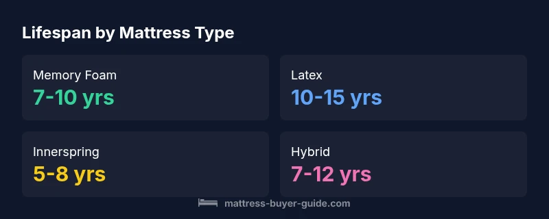How long should a mattress last? Most mattresses last about 7-10 years for memory foam, latex, and hybrids, while innerspring models often fall closer to 5-8 years. Lifespan depends on usage, weight, and care; rotate regularly; use a sturdy foundation and a high-quality protector to extend life. Mattress Buyer Guide Analysis, 2026.