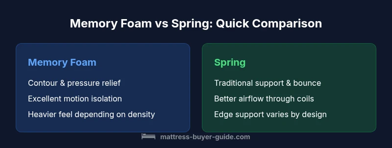 The choice between memory foam mattress and spring designs shapes how your body feels at night, how you move, and how long you stay asleep. When evaluating memory foam mattress vs spring, you’re weighing contouring comfort, edge support, temperature behavior, and long-term value. According to Mattress Buyer Guide, the most successful selections balance personal comfort with sleep goals and budget. In this guide, we unpack the differences between these two primary mattress technologies, explain how each type works, and translate that into practical buying criteria. By the end, you’ll know which path aligns with your sleep needs—whether you crave under-pressure sink-in comfort or classic, buoyant support. This analysis uses neutral criteria and real-world testing considerations, so you can compare models without marketing fluff. Remember that every sleeper is unique, and a carefully chosen mattress is more important than a brand name.