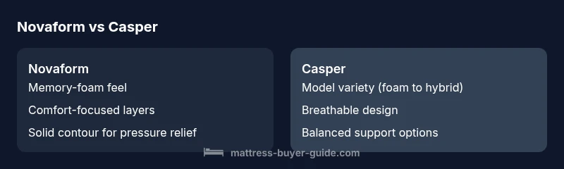According to Mattress Buyer Guide, Casper emphasizes versatile sleep solutions with a range of models designed for different sleep styles and temperatures, while Novaform leans into memory-foam comfort and pressure relief. The novaform mattress vs casper discussion often centers on feel, cooling, and durability, but the right choice depends on your room conditions, sleeping position, and budget. Casper often highlights breathability and a cool feel across many models, whereas Novaform focuses on contouring and slow-sinking memory-foam comfort that memory-foam fans seek. Both brands offer a spectrum of models, from all-foam to hybrid designs, so it's helpful to map your priorities against the features of representative models from each brand. In this section, we lay out the core philosophies behind novaform mattress vs casper and how those philosophies translate into everyday sleep quality. The goal is practical guidance, not marketing gloss.