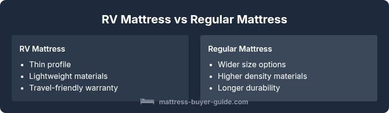According to Mattress Buyer Guide, an RV mattress is engineered for compact spaces and travel resilience. It must balance lightweight construction with enough support to handle rolling motion during trips. In practice, many RV mattresses use foam cores or hybrid constructions that minimize weight, reduce heat buildup, and fit standard RV bed bases. The result is a mattress that folds or fits into tight spaces, yet still aims to deliver comfortable nights on the road. When you compare rv mattress vs regular mattress, the setting matters: in an RV you value portability and minimal intrusion into living space, while at home the emphasis shifts to long-term comfort and durability. The Mattress Buyer Guide team has observed that travelers often prioritize weight and moisture resistance, whereas home buyers prioritize density, warranty, and temperature control. Understanding these priorities helps you pick a model that aligns with actual usage and sleep needs.