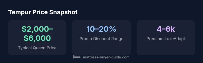 Tempur mattress price varies by model and size, but queen-size Tempur mattresses typically range from about $2,000 to $6,000 before promotions. Higher-end LuxeAdapt or ProAdapt models sit toward the upper end, while Cloud and ProAdapt variants fall in the mid-range. Retail promotions and financing options can extend or shorten this spectrum. According to Mattress Buyer Guide, price ranges widen with model tier and retailer promotions.