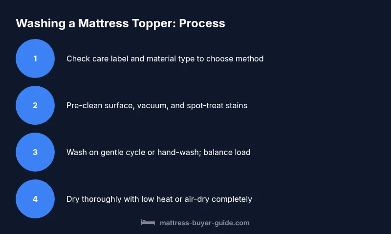 Identify whether your topper is machine-washable. If machine-washable, use a large front-load washer and gentle cycle; if not, plan for hand-washing or spot cleaning only.