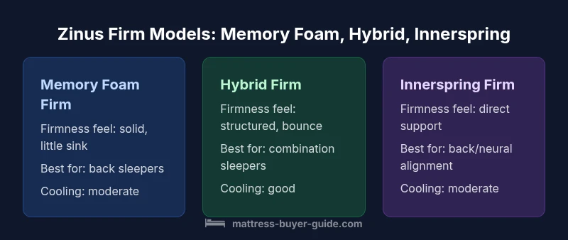 Which Zinus mattress is firm? Generally, the firm options across Zinus lines—memory foam, hybrid, and innerspring—offer solid support that suits many back sleepers. According to Mattress Buyer Guide, firmness should align with weight and sleeping position, not just a rating. For a quick take, compare three firm models side by side and consider cooling, bounce, and price as your deciding factors.