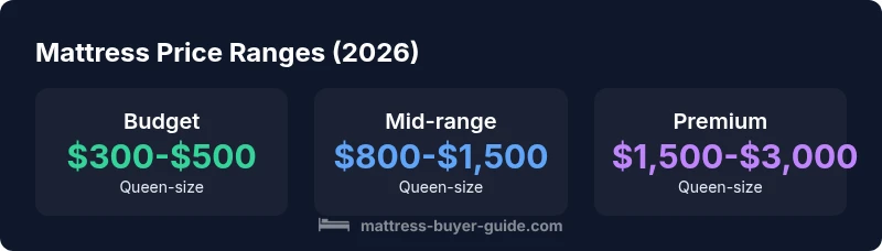 Mattress price in 2026 generally spans from about $300 for basic budget models to $3,000–$4,000 for premium hybrids and luxury latex sets. The majority of buyers pay in the mid-range, roughly $800–$1,500 for queen-sized options. Price depends on type (foam, innerspring, hybrid), size, durability, and warranty. Mattress Buyer Guide analysis shows this broad spectrum helps shoppers budget effectively.